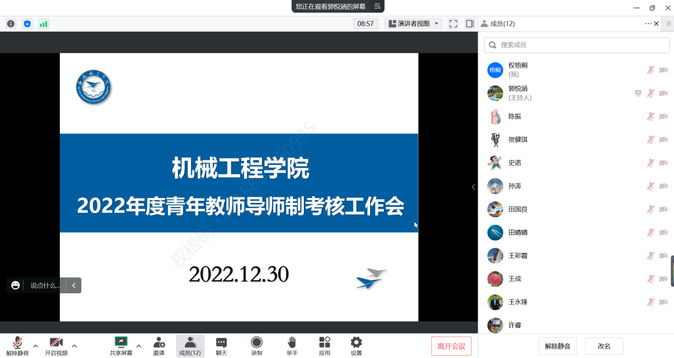 2022年12月30日,公司召开青年教师导师制考核工作会议。考核小组成员、考核对象和指导老师参加会议。会议由考核小组组长王永锋经理主持。