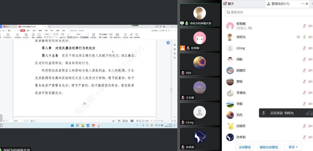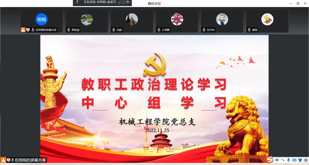 10月13日,公司党总支召开10月中心组学习会议,会议采用线上方式进行。会议由孙茉莉书记主持。公司党总支中心组成员参加会议。本次会议主要进行纪律作风专题和师德师风专题学习,学习的内容有:《习近平总书记关于全面从严治党、党风廉政建设、纪律建设、廉洁文化建设的重要论述》《作风突出问题专项治疗重点任务清单》《师德师风突出问题专项治理实施方案》《中国共产党纪律处分条例》《党委(党组)落实全面从严治党主体责任规定》《中共中央办公厅关于进一步激励广大干部新时代新担当新作为的意见》。会上中心组成员王永锋、李懿做了重点发言和学习。王永锋经理强调,各位领导干部做好本职工作,向同仁学习;转变思想观念,提升服务水平。切实解决师生的问题,转变官本位思想,不推诿不扯皮,创新工作方法,提高工作效率,以解决问题为导向,简化流程;成立信息监督委员会,公开透明信息,开通师生建议意见监督通道;强化责任担当,领导干部以身作则,率先士卒,参与到疫情防控第一线。