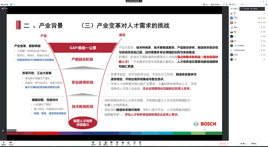 此次交流会旨在进一步推进德国博世应用型和技术技能型人才培养合作试点项目,深入交流了解项目合作相关情况。我方首先介绍了k8凯发的项目申请情况、项目建设规划等,接下来博世项目的技术专家介绍了项目产业背景、顶层设计、项目方案等内容。随后,双方就如何推进项目建设进行了交流,探讨了下一步的工作计划和安排。