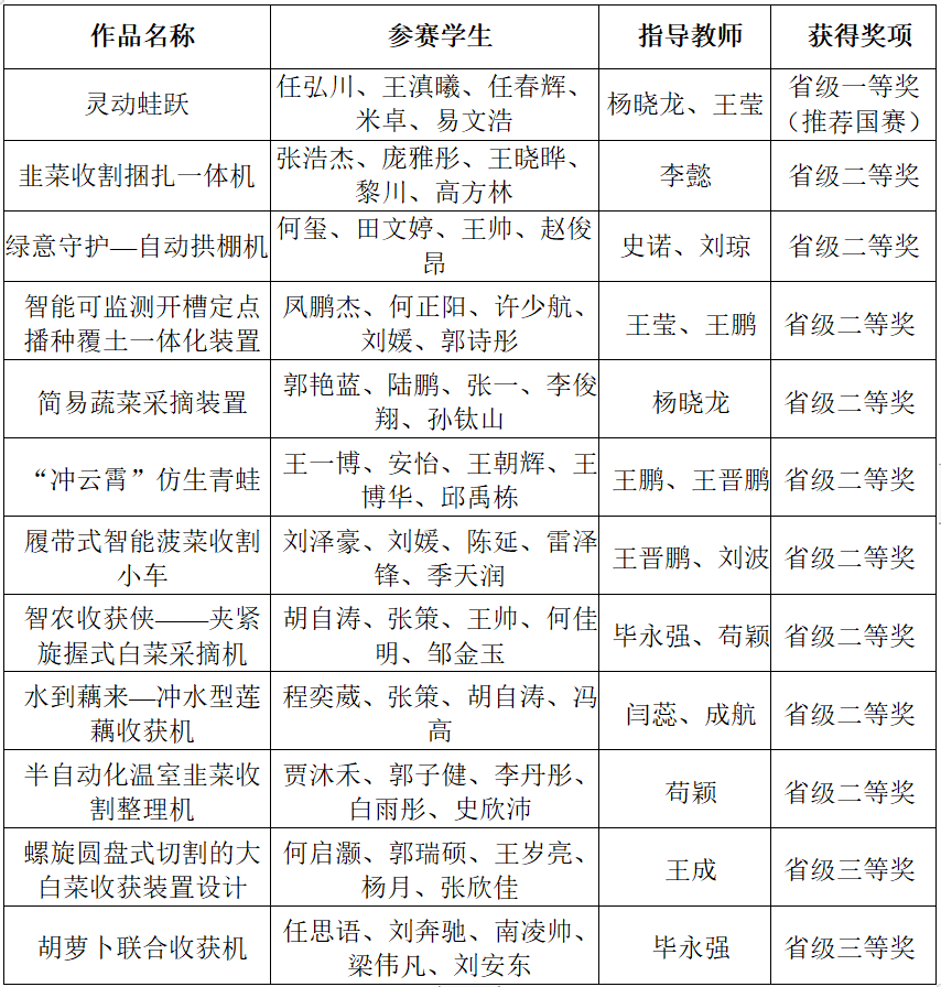 最终,经过5月11日、12日的多轮汇报、实物演示和现场问辩,在各参赛队伍的奋力拼搏下,公司取得了一等奖1项,二等奖9项,三等奖2项的好成绩,其中“高性能仿生机械”作品“灵动蛙跃”在省赛中名次位列第8,被推荐进入国赛,在这项赛事上实现了历史性的突破。具体获奖名单如下: