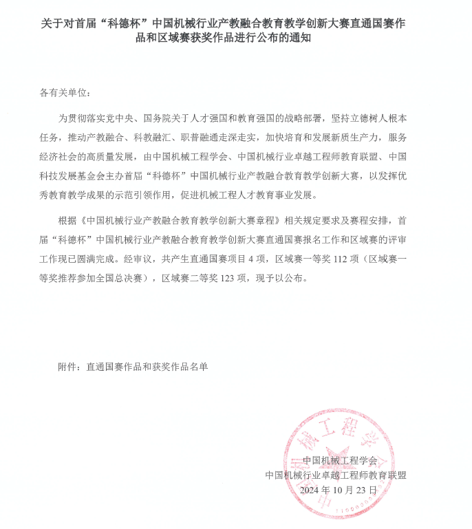 首届中国机械行业产教融合公司产品创新大赛由中国机械工程学会、中国机械行业卓越工程师教育联盟主办,以“教学创新推升高质量育人,产教融合激发新质生产力”为主题,设本科组、研究生组,每组按课程类和体系类赛道分别进行评选。