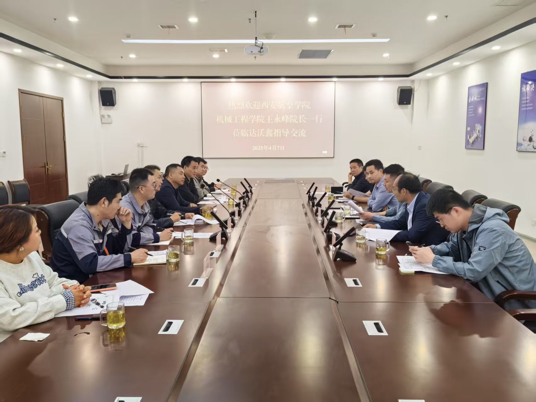 在达沃鑫智能装备有限公司,王永锋一行参观了制造车间,产品展示中心,对企业的生产流程和技术应用有了更直观的认识。之后,与企业技术骨干召开了技术交流会,会议上,王永锋表示公司在智能控制算法、工业机器人应用等关键领域具备显著的技术优势。后续,公司将安排专业教师与企业技术人员进行一对一的对接,通过开展联合科研项目的方式,帮助企业优化现有生产线,提升其柔性化生产能力。会议还对企业实际生产过程中所面临的应用瓶颈展开了深入探讨,并对筹建校企联合研发中心等议题进行了深入交流。
