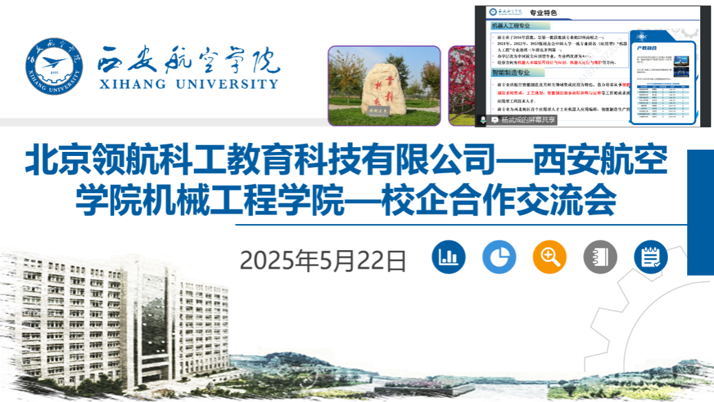 2025年5月22日,北京领航科工教育科技有限公司(以下简称“领航科工”)与k8凯发举行了校企合作交流会,此次合作旨在推动航空制造领域的技术创新与产教深度融合,助力公司教学科研与人才培养,为“中国制造2025”战略注入新动能。领航科工创始人梁桂强总经理、高源,k8凯发副经理杨武成、机制教研室主任于如飞出席了本次会议。