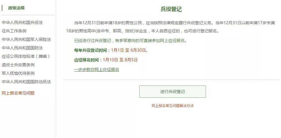 2019年全国征兵网网上登记报名已于1月10日开始。全国广大适龄男青年可登录全国征兵网进行兵役登记和应征报名,之后根据兵役机关安排进行实地初审初检。