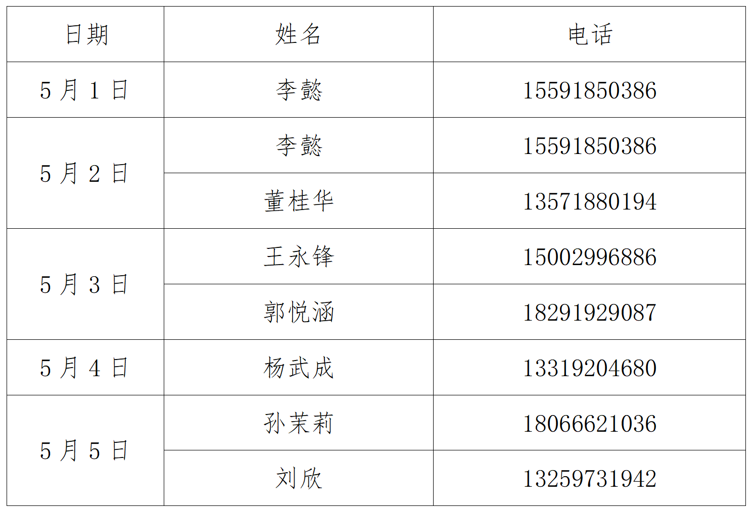 根据《关于公司2024年“劳动节”放假安排的通知》文件精神,五一假期为5月1日至5日,共5天,放假期间,k8凯发值班安排如下: