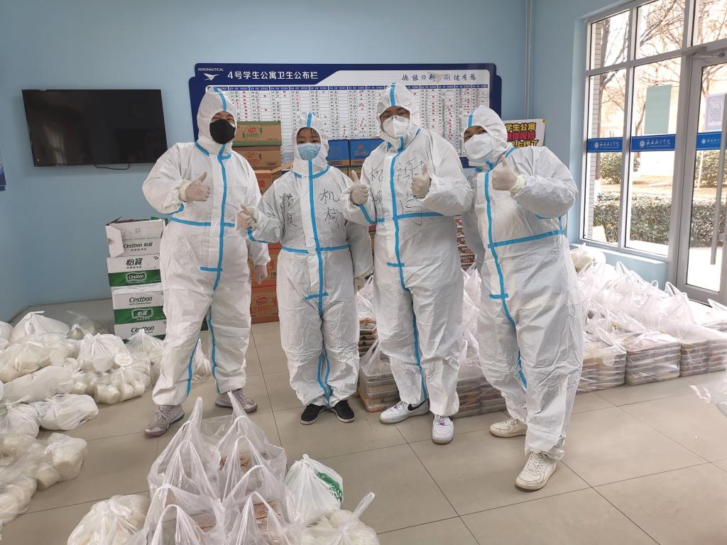 员工党员和积极分子主动申请参与志愿者服务工作,累计达123人。每天几千份盒饭、几百桶桶装水和成箱的生活物资仅靠志愿者们一层层爬楼送达。他们肩扛手抬,上下奔波,几个来回下来累的不能走动,大部分志愿者都是连续奋战,毫无怨言。除了生活物资的运送,每日的厕所消杀和垃圾运送任务艰巨,志愿者们克服困难,承担着被感染的风险,不怕脏和苦,默默地工作着。穿梭在楼间的“大白”给了同学们希望和温暖,鼓励着彼此不再害怕和担忧。