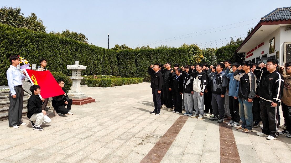 在庄严肃穆的阎良烈士纪念碑和中国飞行试验研究院烈士公墓前,全体师生整齐列队,肃立默哀,向革命先烈致以崇高敬意。王鹏博老师带领员工党员重温入党誓词,铮铮誓言在陵园内回荡,表达了师生们继承先烈遗志、永葆政治本色的坚定决心。