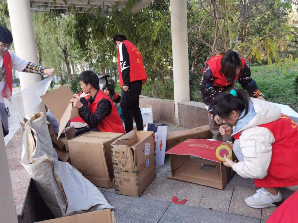 11月13日下午,志愿者们对材料进行测量、裁剪、拼接,从猫窝的形状、保暖性、抗风性、防水性多个方面考虑,把“猫窝”纸箱建的既结实又牢固,又在猫窝的外面画上了各种可爱的图案。通过对小猫的观察,将“爱心猫窝”放置在小猫经常活动的一号公寓楼、四号公寓楼以及五号公寓楼。