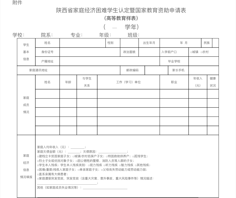 附件:陕西省家庭经济困难员工认定暨国家教育资助申请表